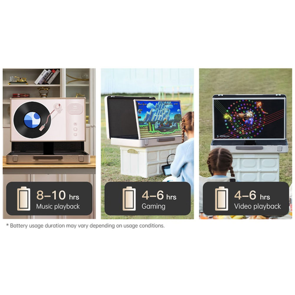 باتری داخلی 6800 میلی‌آمپر ساعت، یکی از نقاط قوت اصلی این دستگاه است؛ با یک بار شارژ می‌توانید چند ساعت فیلم ببینید یا موسیقی گوش دهید بدون نیاز به پریز برق. وزن و طراحی کیف‌گونه با دسته حمل، امکان جابجایی راحت را فراهم می‌کند. این یعنی می‌توانید آن را با خود ببرید — کمپ، باغ، مهمانی، فضای کار یا هر جایی — بدون دردسر کابل و پریز.